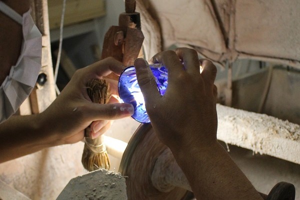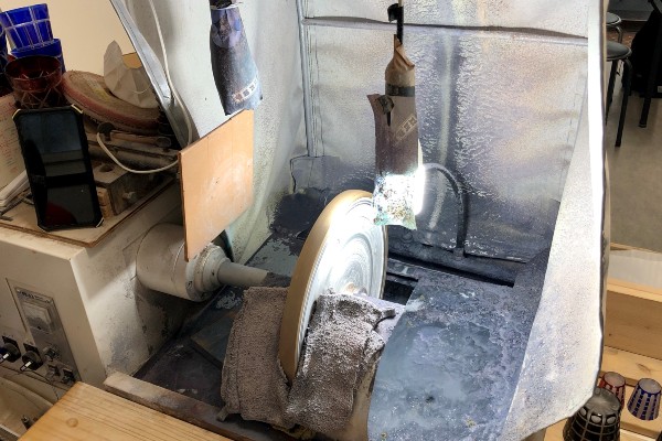 Mr. Shimizu receives the coloured glasses from the manufacturer, then spends his day following several procedures on grinders, such as this one, to produce the finished glass. After drawing the pattern on each glass he first cuts the initial outline, then progresses to cut the increasingly intricate designs within that pattern. His speciality is the final process, the one that creates the frosted glass effect.