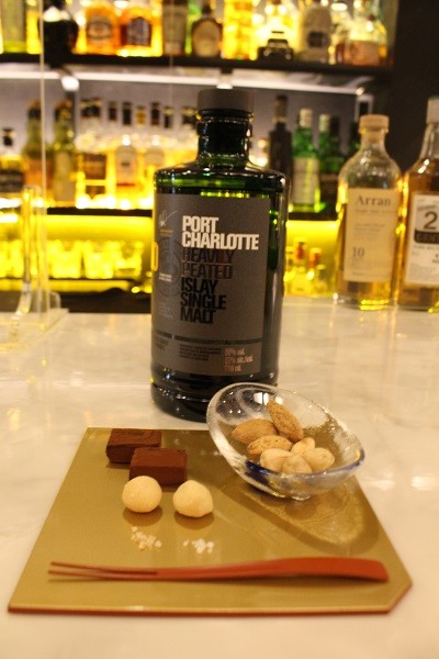 While Bar.suzuki doesn’t serve food, it does offer some stylish traditional confectionery such as ohagi, made from red azuki beans, and konpeito sugar candies from Kyoto. Ms. Suzuki also pairs this Port Charlotte 10-year whiskey from the Bruichladdich distillery on Islay with some Royce whiskey liqueur chocolate and nuts. Customers may also order out and have food delivered.