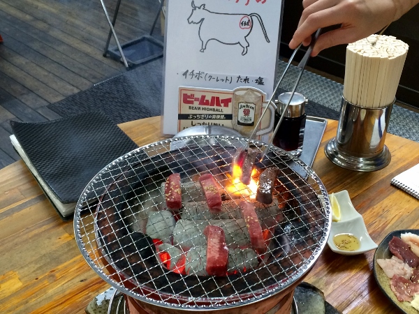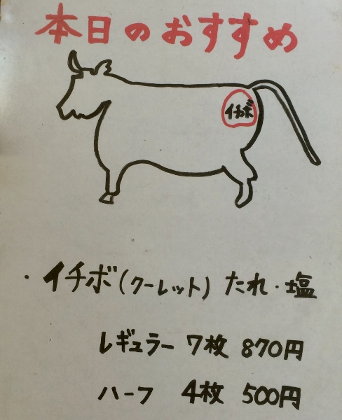 Currently popular at Sumiyoshi Horumon is the ‘ichibo’ (H-bone) cut of rump steak. Seven slices for 870 yen seems like exceptional value for money.
