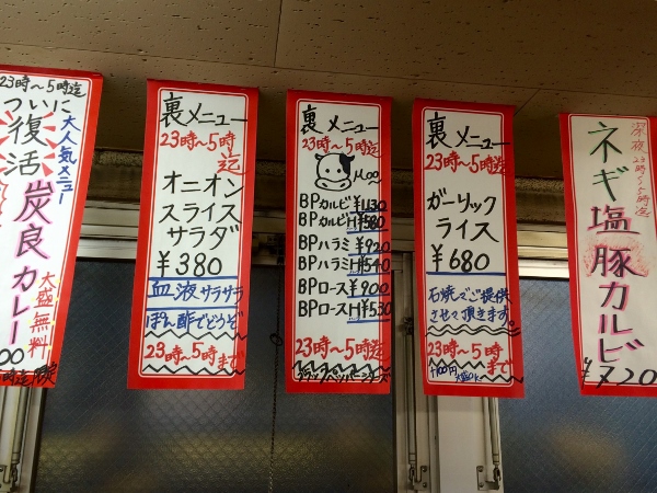 The endless variety of items on the menu is almost mind-boggling. In fact, you can eat most parts of a cow, if you so wish. These banners show the late-night (11pm to 5am) menu. There are generous all you can eat deals and all you can drink specials, as well as discount for parties of ladies. Many of the horumon cuts, particularly the large and small intestines, contain enormous quantities of collagen, which is supposedly beneficial in rejuvenating your skin.