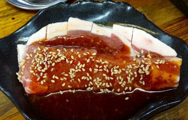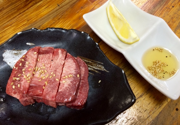 Most yakiniku eaters start with tongue. At Sumiyoshi Horumon a plate of thick cut, lightly salted tongue costs a mere 950 yen and it’s delicious. Thick and juicy, it’s wonderful with a squeeze of lemon. It’s the perfect way to start your meal.