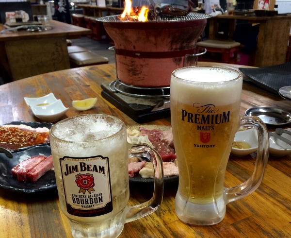 The drink menu is nearly as extensive as the food menu with enough cocktails, sours and mixed drinks to satisfy even the thirstiest person. Sumiyoshi Horumon proudly boats it sells the most Jim Beam highballs in all Japan. At only 380 yen each it’s easy to see why. The beer’s ice cold and really hits the spot. Cheers!