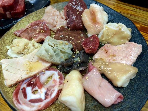 Wow! Next up is this plate of horumon, called a ‘mini’ and containing 16 different cuts of meat. Just what is horumon? It’s another word for cuts of meat that weren’t traditionally eaten, or offal in English. It is said that the name horumon comes from the Greek word hormōn, meaning to ‘impel, set in motion’. The word hormōn is also the origin for the English word ‘hormone’. In the Osaka dialect of the Kansai area, ‘horu’ means to throw away and ‘mono’ means thing, hence the idea that offal was thrown away and not consumed as food. It includes such things as tripe, intestines, heart, and so on. The ‘mini’ is 980 yen while a ‘double’ will set you back 1680 yen.