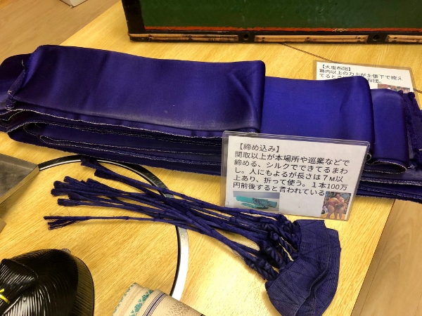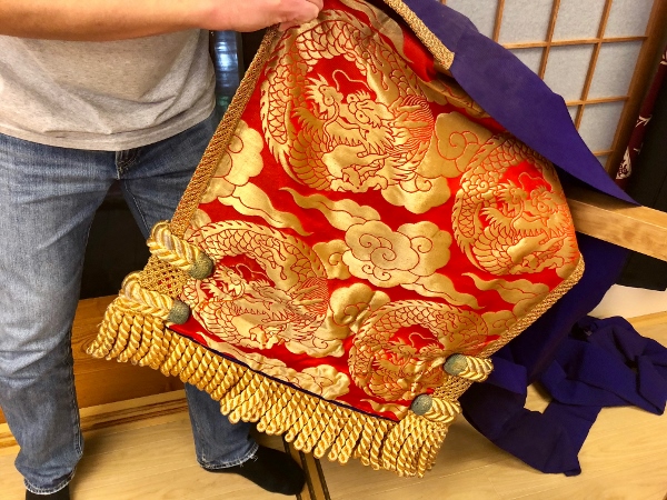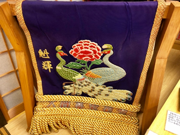 This is Mr. Nishino’s father’s ornamental apron as worn by wrestlers for ring-entrance ceremonies. They’re hand-sewn by specialists and cost a small fortune, as you can imagine.