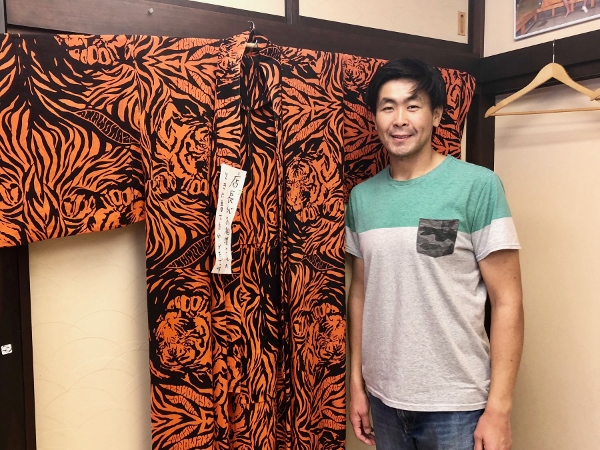 Here, Mr. Nishino stands beside the yukata he wore during his career. Note the tiger pattern! It’s incredibly voluminous, but then it had to be.