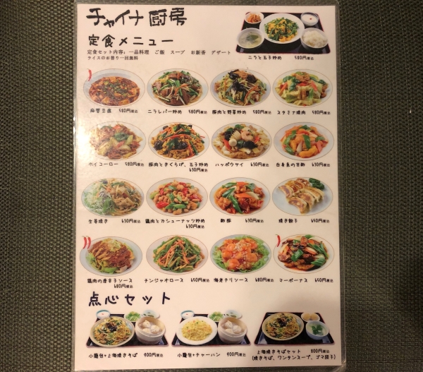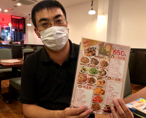 Here Mr. Sho models his innovative drink set menu. For either 550, 600, or 650 yen customers can select a drink (draft beer, sours, highballs, makkori, cocktails etc) and one dish from the 78 featured on the menu here. Most of the popular Chinese dishes are available: mabo tofu, shrimp in chili sauce, sweet and sour pork, twice cooked pork, plus many, many more.