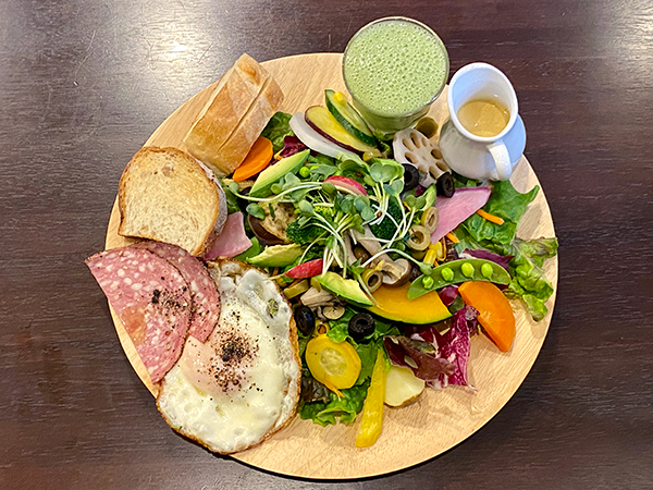 The most popular item on the Cafe Fleur menu is the Fleur Salad Plate (1,300 yen on weekdays), which comes with a smoothie and dessert. We’d heard it was a hearty serving but were astonished at the size of the platter and the 22 or 23 seasonal vegetables it contained. Even Ms. Nagai wasn’t sure how many ingredients went into it! The salad plate is available for 1,000 yen as a single order item on weekends, minus the smoothie and dessert.