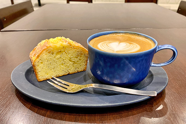 Ms. Nagai has spent many years working to perfect her cakes. The lemon and poppy pound cake (450 yen) pictured here with a creamy latte contains the juice and peel of one and a half lemons, which lends it a real tangy citrus punch. Very nice, particularly with a slightly tart coffee such as Kenya, Ethiopia or Colombia