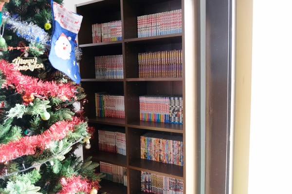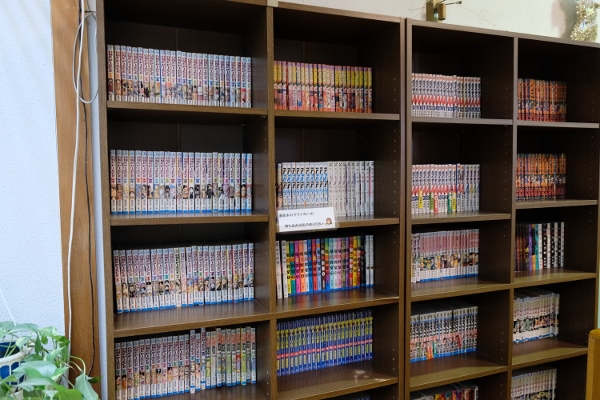 There’s also a well-stocked bookshelf, packed mostly with popular manga (Japanese comic) titles. There’s a lot of manga on the premise…