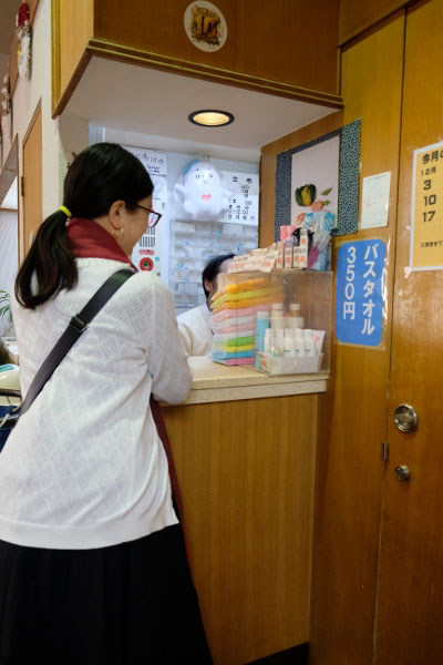 The front desk also offers items for sale like drinks and bathing kits. Many people will bring their own towel, shampoo and other toiletries with them to a sento; but if you forget, or decide to drop by on a whim, Tatsumi-yu sells bath towels, face towels, and towel kits! The latter, called a “tebura kit” (tebura means “empty-handed”) comes with a face towel, 2-in-1 shampoo & conditioner, soap, toothbrush, and a hair tie or ladies or a razor for men.