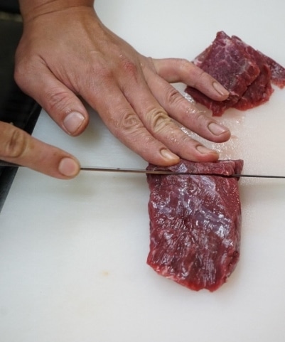 Demonstrating how he prepares dishes prior to cooking, Mr. Tanaka takes a piece of beef; the restaurant uses Japanese, Australian, and US beef depending on the part being served, and carefully slices it at an angle to get the best out of the meat when it is cooked. He says they only use high quality meat, graded A4 and A5 under Japanese standards.