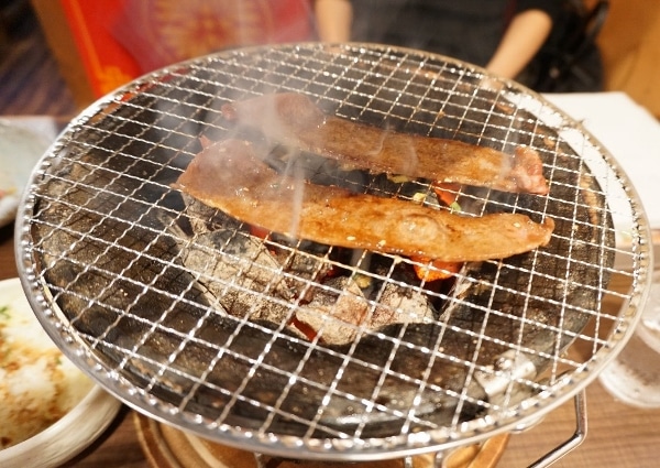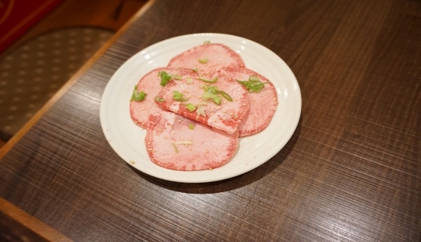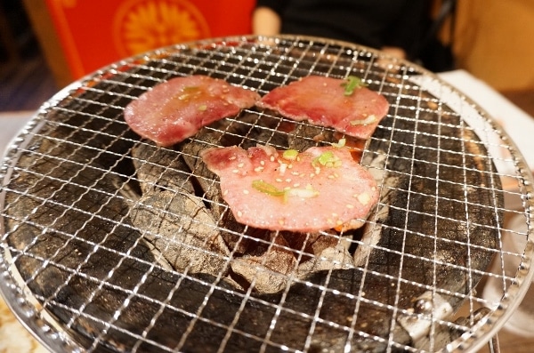 To demonstrate the quality of the meat used by Sumibiyakiniku Karubi-tei, Mr. Tanaka rustled up some gyutan with a lemon dip, and prime Japanese beef kalbi with a sweet dip for us to try, along with a bowl of the restaurant’s speciality, “negimeshi”.