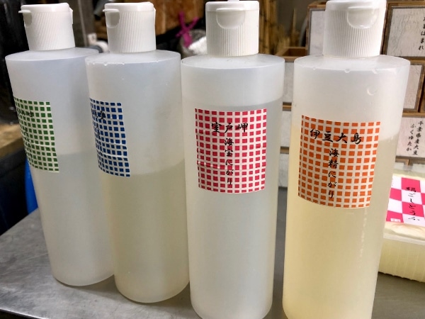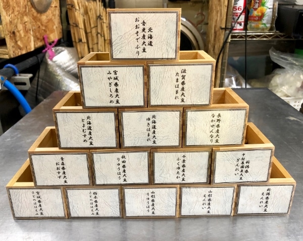 As he explains it, soybeans have a “terroir” like grapes or tea, which imbues them with unique characteristics, suitable for different products. Mr. Kaneko also uses four types of bittern, all of which have differing mineral content. Two are produced in Izu Oshima and Mie, while the other two are trade secrets!