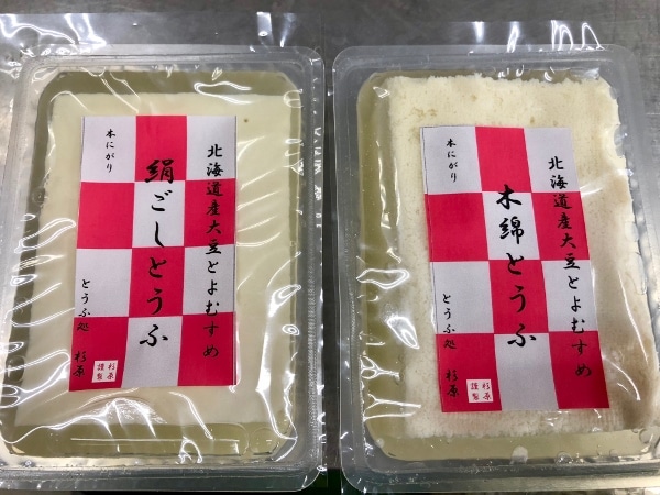 Not only has Mr. Kaneko learned how to make tofu by intense study coupled with trial and error, he has also become a package designer. This tofu, made from the Hokkaido soybean type toyomusume, features a traditional checkerboard pattern known as “Ishimatsu moyo.” The pattern can be seen in the logos for the 2020 Tokyo Olympics but here Mr. Kaneko has used pink, as “musume” in toyomusume means daughter in Japanese.