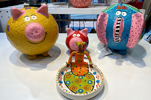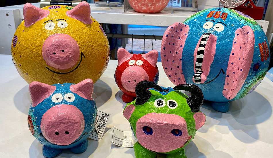 The papier mache pig, cow, and elephant piggy banks were so appealing.