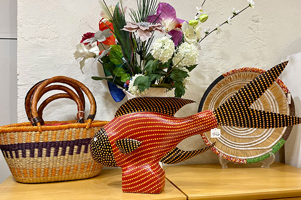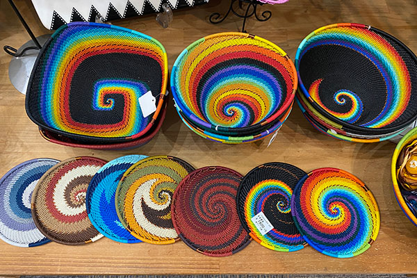 The baskets (4,180 yen including tax) and coasters (1,600 yen excluding tax) are handmade from telephone wire, a traditional art in South Africa.