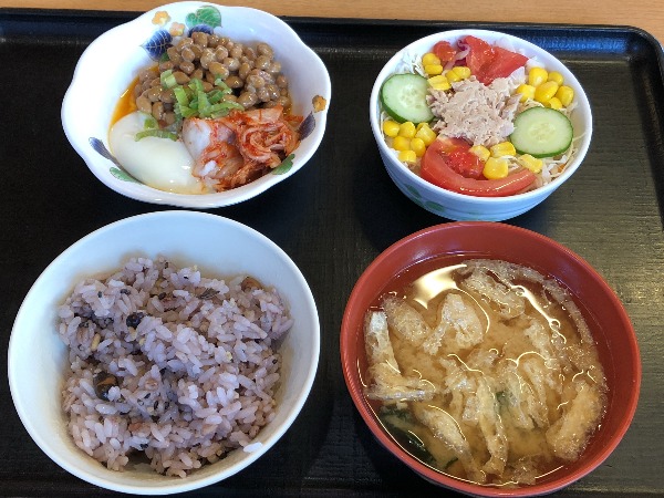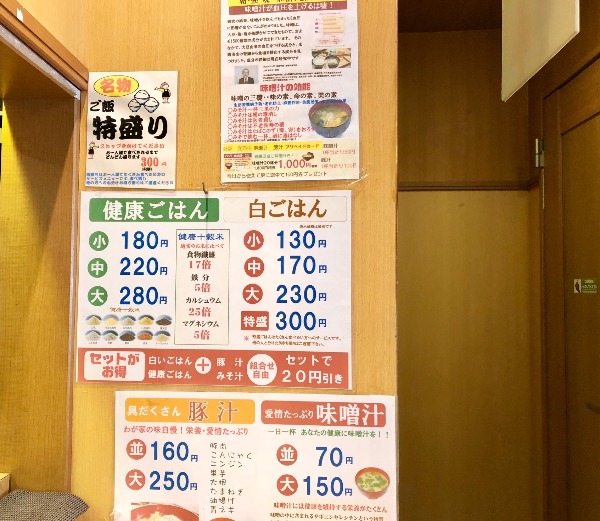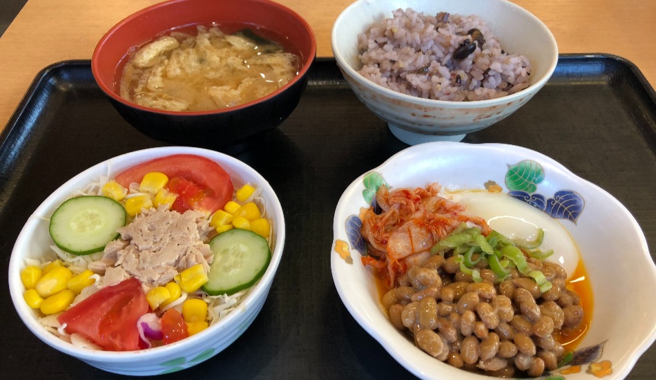 The spicy stamina bowl (188 yen) on the top right features an onsen tamago, an egg slowly cooked in warm water that leaves the white runny and the yolk firm. The fermented soybeans (natto) and the spicy kimchi are highly nutritious. The tuna salad comes in at 148 yen, with the medium sized bowl of multigrain rice at 220 yen and the miso soup with fried tofu skin (aburaage) and seaweed at 70 yen. That’s a filling, nutritious base for just 626 yen, before tax. Add a main dish and the total cost will be around 1,100 yen, remarkable value for money.