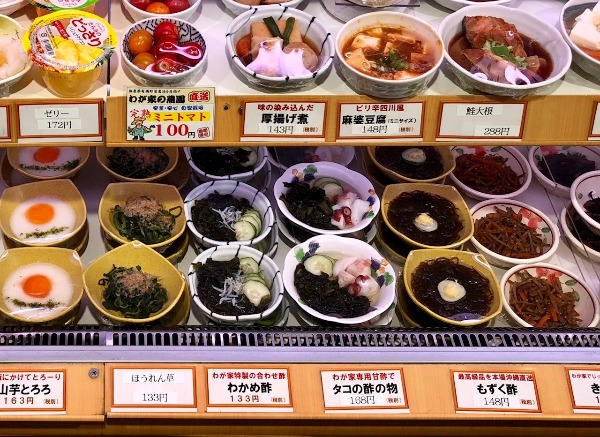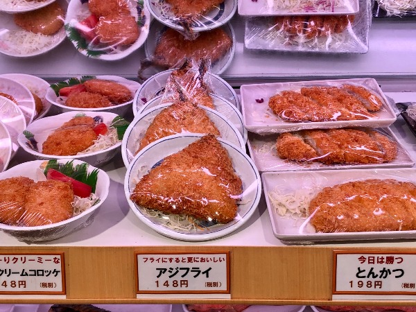 The immensely popular creamy crab croquettes are just 148 yen, the horse mackerel (aji furai) is the same price, while the deep-fried pork loin (tonkatsu) is 198 yen. Not only are the prices astonishing but most of the dishes are things people rarely prepare for themselves at home.