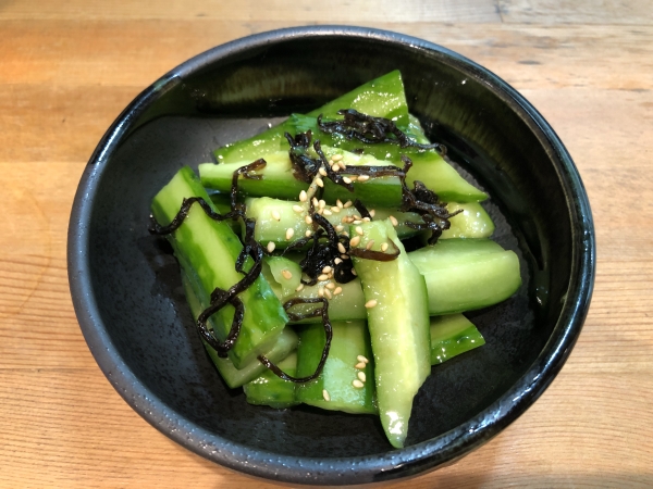 This dish of crisp sliced cucumber garnished with salted kelp (konbu) and sesame (360 yen) was a chilled contrast to the juicy chicken delights and would doubtless be very appealing with a nice cold beer. An egg and potato salad is also available.