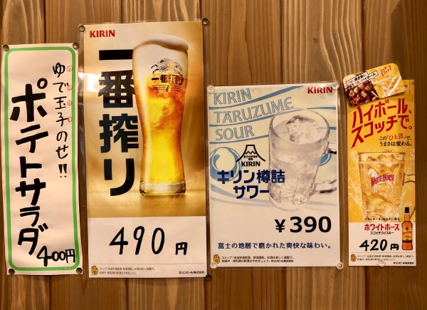 Speaking of beer, it’s Kirin Ichiban Shibori at 490 yen a glass on draft. The highball craze shows no sign of abating, with White Horse whiskey (420 yen) the preferred choice at Yakitori Keichan. All the usual soft drinks are available too.