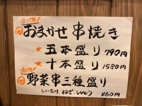 For many people it may be easier to order an omakase set (chef’s choice) of five sticks for 790 yen, or ten for 1,580 yen if you’re really hungry. The three vegetable sets of shiitake, negi onions, and shishito peppers are just 460 yen. All prices mentioned here are before tax.