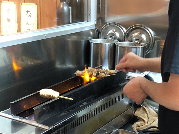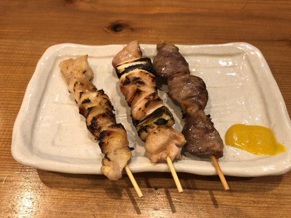 From left to right the plate features parson’s nose (bonjiri, 160 yen), chicken and negi onion (negima, 170 yen) and the top-selling heart (hatsu, 170 yen). “All of our chicken is from a well-known Japanese free-range mixed-breed chicken (jidori),” explained Mr. Shimoda. “The sauce (tare) is homemade too.”