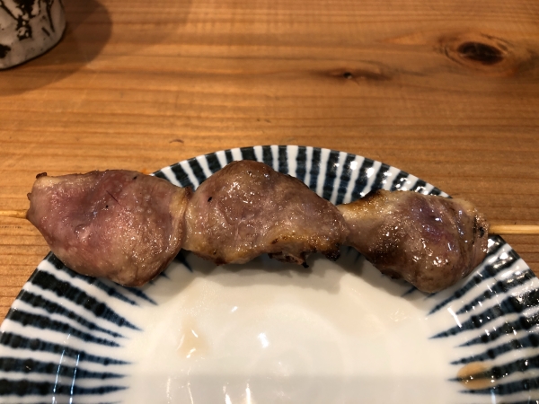 We were particularly intrigued to hear that the heart (hatsu) was the top-seller; although it has aficionados it’s never the most popular on the yakitori menu. But then we tried it and discovered that it’s incredibly soft and juicy. In fact, this is easily the softest and juiciest heart yakitori we had ever sampled. Bravo! The parson’s nose was crispy on the outside and soft inside, while the chicken was again exceptionally juicy, and the pieces were very large.