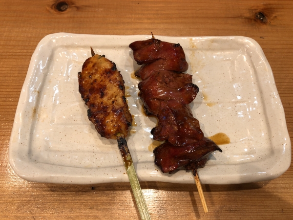 Next up were two skewers featuring the homemade sauce, chicken liver and chicken meatball (tsukune). “The chicken meatballs contain just a little finely chopped cartilage, a touch of garlic and a little more ginger,” said Mr. Shimoda.