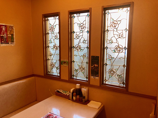 The unusual stained-glass windows diffuse the light and create a snug, inviting atmosphere.