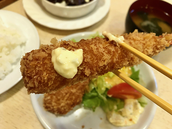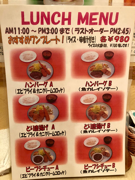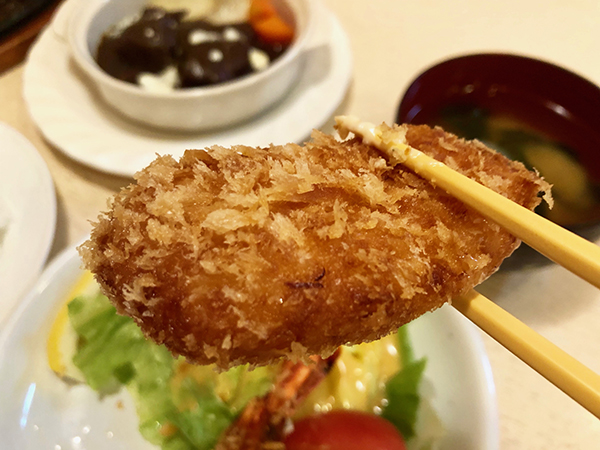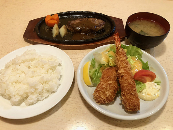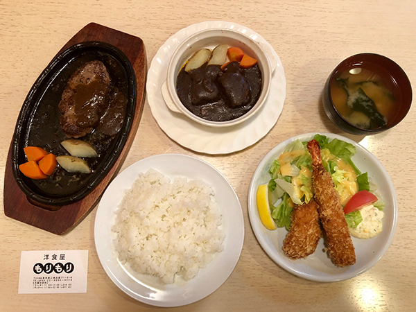 “We have two menus, one for lunch, and one for dinner,” says Mr. Mori. “The lunch menu features sets, with hamburg steaks, fried chicken and beef stew as the main .” Hamburg Set A is the most popular, pairing a 100% Japanese beef hamburg with a large deep-fried shrimp and a crab cream croquette. The other A sets feature fried chicken or beef stew instead of the hamburg, while the B sets includes fried Japanese flounder instead of the shrimp and croquette.