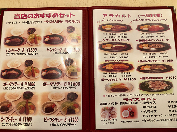 The dinner menu features a variety of sets such as the one detailed above, the Beef Stew A set which costs 1700 yen. The hamburg isn’t part of the set. Many favourites are featured, such as sautéed pork, pork cutlets, croquettes, salads, gratin and doria. Doria is a well-known Japanese Western-style dish, a kind of gratin made with rice and white sauce. There’s also an extensive drinks menu featuring a variety of beers, shochu, wine, and more.