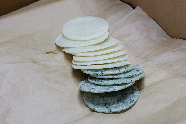 これが、おせんべいの生地(きじ)。山形県(やまがたけん)など、日本国内でとれたお米を使って作っています。これをやくと、おいしいおせんべいがかんせいするんだって!