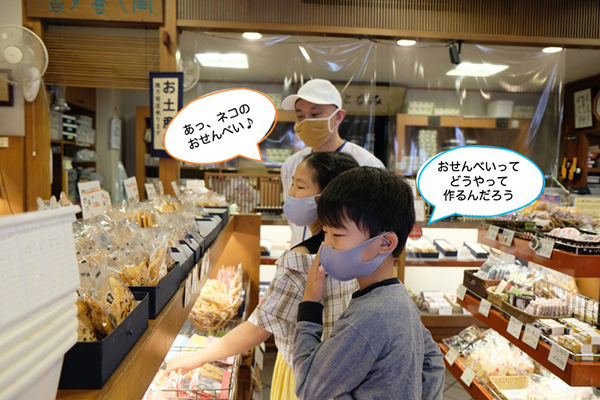 店ができたのは昭和(しょうわ)23年。長い間、でんとうをまもりつづけるおせんべいやさんです!