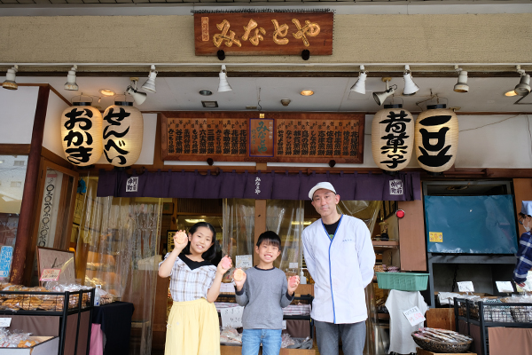 まず二人は、永代通り(えいたいどおり)ぞいにある、大きなかんばんとちょうちんが目じるしのおせんべいやさん「みなとや」に行きました!