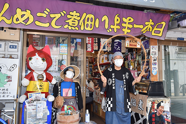 とおくから観光(かんこう)で来たお客さんには、「深川(ふかがわ)めしの素(もと)」など、おすすめ品がひと目でわかるように工夫しています。