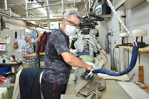 △お店のおくにある工場には、大きなせんたくきが何台もあり、大岩さんはいそがしそうにアイロンをかけていました