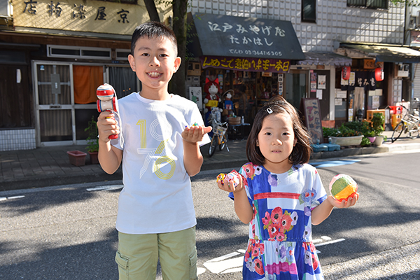 まずは、地元・深川っ子なら誰もが知っている「江戸みやげ屋 たかはし」に行きました。「こども記者」のともひろさん・ゆうみさんにとってもおなじみのお店です。