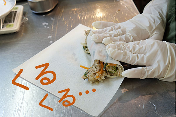 △ はるまきの具を皮でまいていきます