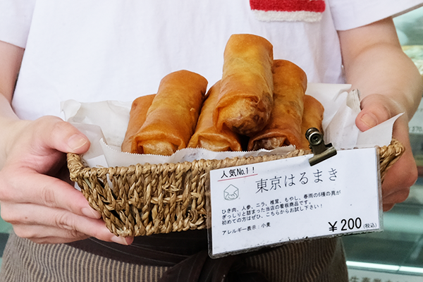 ひき肉、ニンジン、ニラ、シイタケ、はるさめ、モヤシがぎっしりつまった「東京はるまき」です。お子さまには「アスパラとベーコンのはるまき」が人気です。