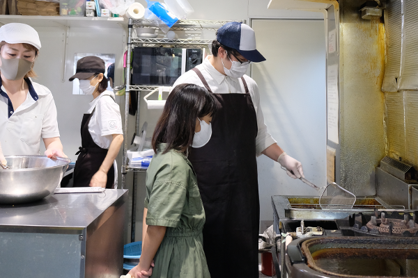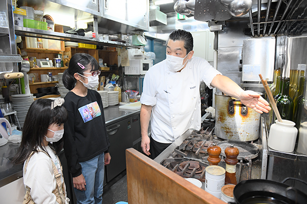むかえてくれたのは、店主の田村さん。さっそく、りょうりを作る「ちゅうぼう」を見学させてもらいました。