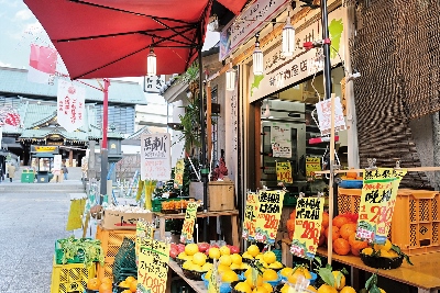 深川不動堂参道に、北海道や熊本から直送の青果がずらり!「親戚や友人が生産者。彼らが作るおいしいものを知ってもらいたい」とお手頃価格で販売。乾物や珍しい果物を手土産に買って帰る参拝客も。