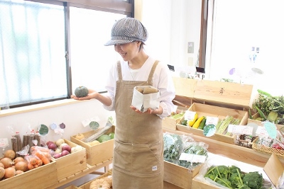 厳選した全国の生産者から届く野菜や果物が並ぶおしゃれな八百屋さん。野菜が主役の手作り惣菜や人気ブーランジェリーのパンも販売。