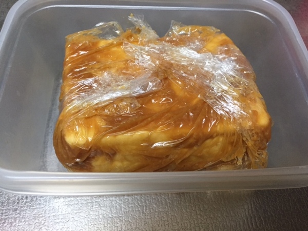 よく水をきった木綿豆腐をガーゼでくるんで、みりんを適量加えてやわらかくした金亀子みそをまわりに塗り、ラップして冷蔵庫へ。このまま1日から1週間置いておきます。