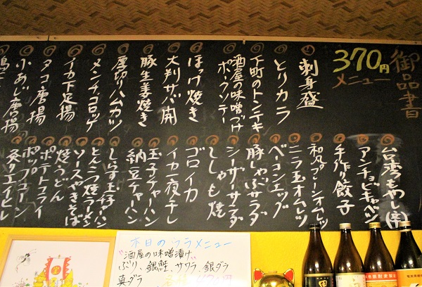 そのほか「とんこつ焼きラーメン」も「大判サバ開き」も「ほっけ開き」も、ぜーんぶ370円。「おしんこ」など小鉢メニューに至っては270円です。