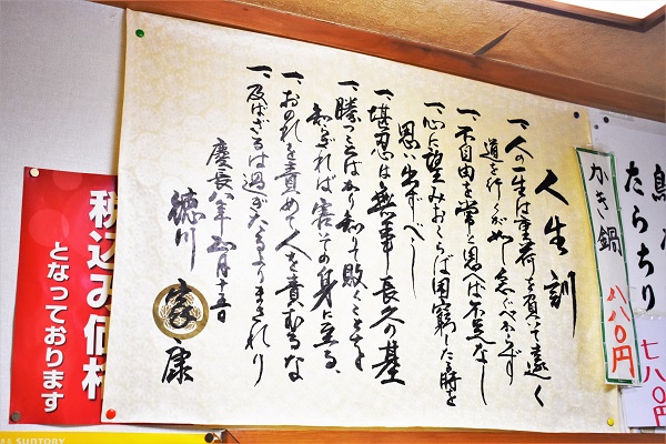 ふと顔をあげると、壁の上には徳川家康の「人生訓」が。お酒を飲みながら、一つ一つ目で追うと……