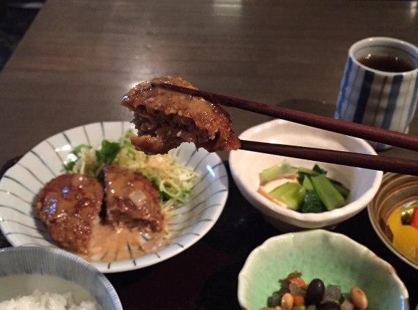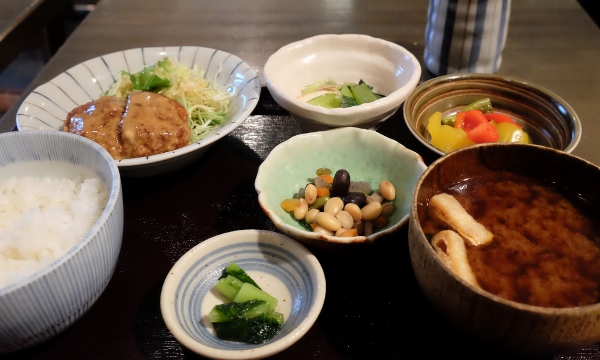 自家製メンチカツをメインにおばんざい3種(この日はお豆の炊きもの・小松菜のおひたし・ピクルス)、ご飯、赤だし味噌汁と香の物がついて880円。