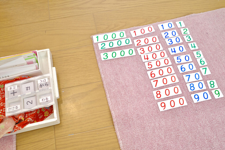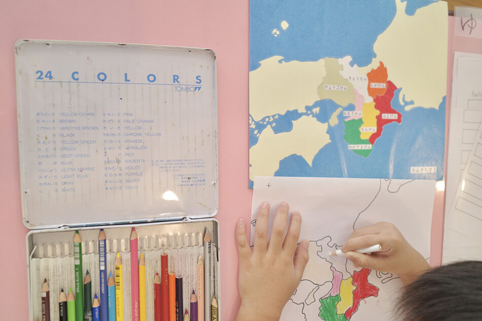 また、卒園時には平仮名、カタカナを習得し文章を書いたり、教具を使って四桁の四則計算も経験します。年長さんになると世界地図、日本地図、宇宙や生命の歴史を学んだり、発表を日常的に行っていきます。