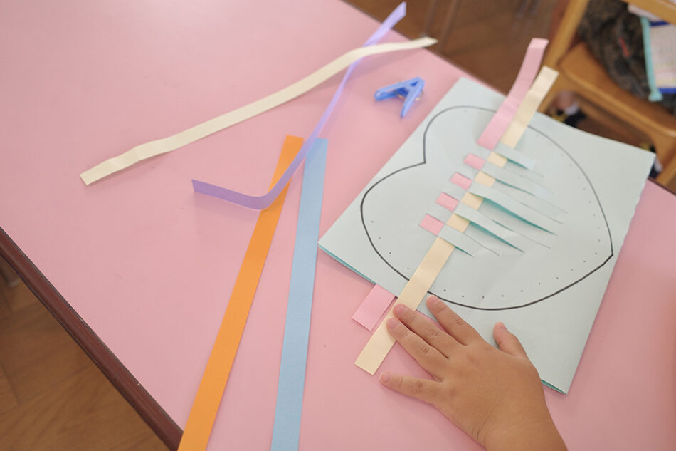 年少さんは、「落とす、つかむ、ハサミで切る、貼る、縫う」等の動きを取り入れた「お仕事」で、洗練された手先の動きを獲得します。