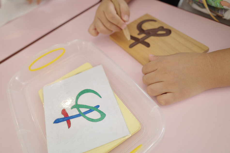 そして、文字に興味を持った子どもは、メタルインセットや砂文字、なぞり文字、堀り文字などのたくさんの教具を使って、字形や書き順を覚えていきます。