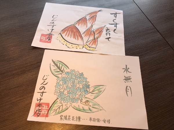 居酒屋タイムのテーブルに並ぶ季節感ある敷き紙の画は女将さん作。心のこもったおもてなしでお客様を迎えます。